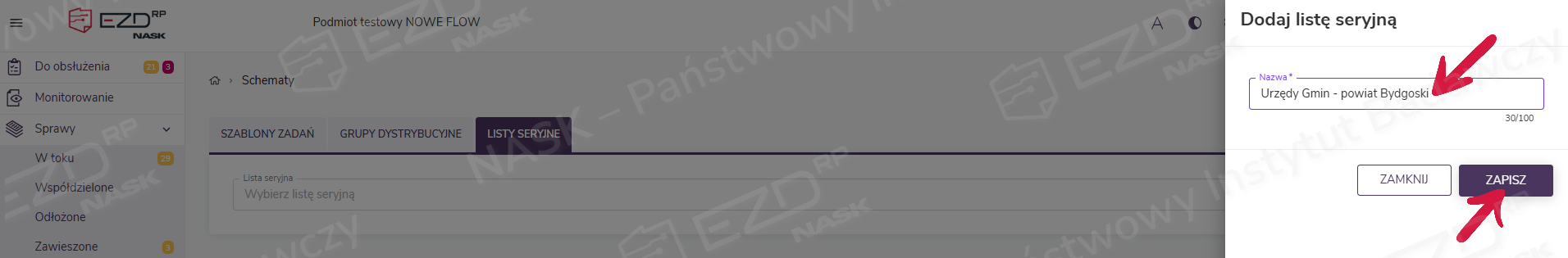 Wyświetli się panel boczny pozwalający na dodanie nowej listy. Wpisujemy nazwę, pamiętając, że jej maksymalna długość to 100 znaków. Aby zatwierdzić utworzenie nowej listy, należy kliknąć przycisk Zapisz.