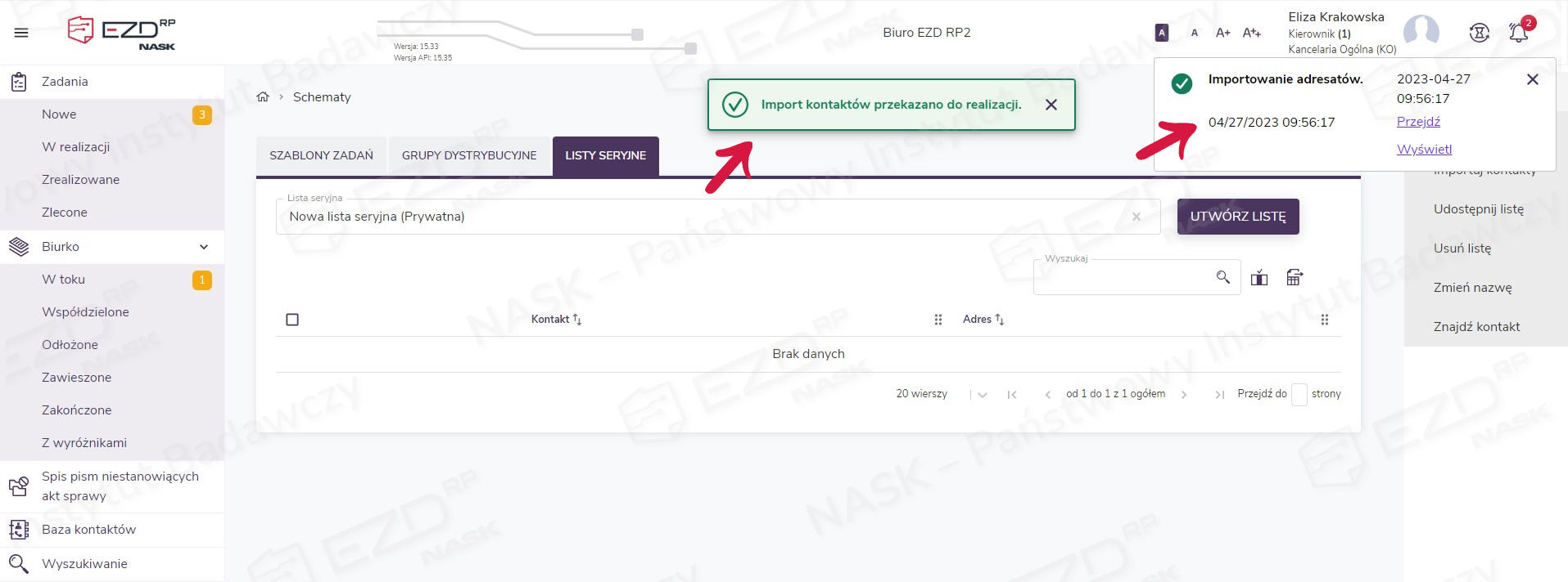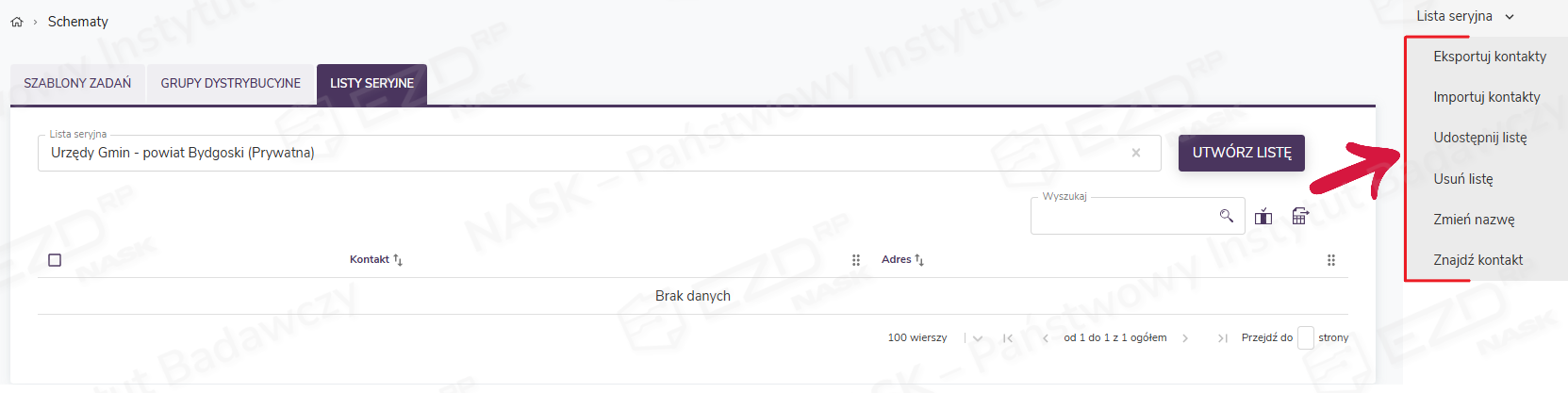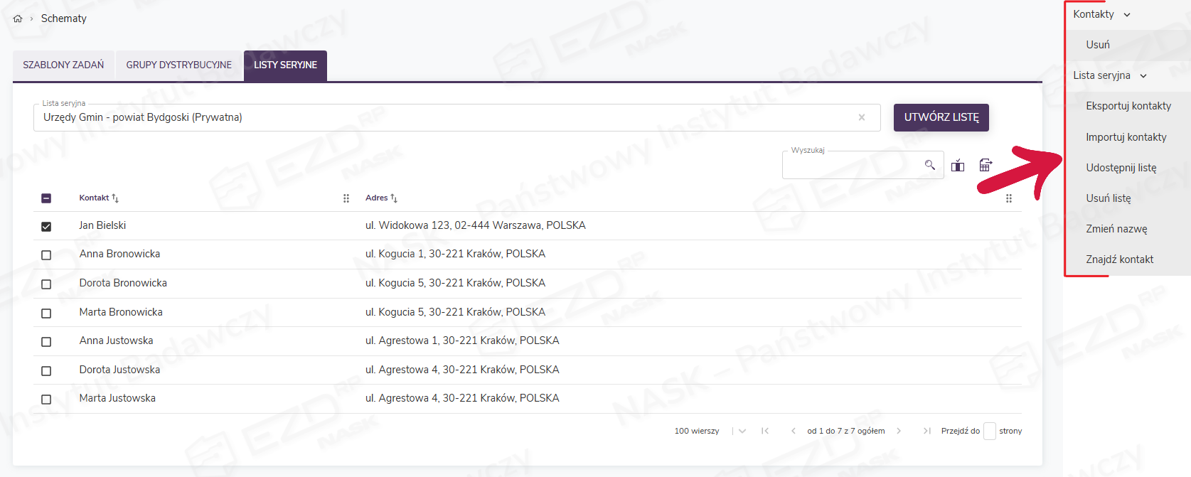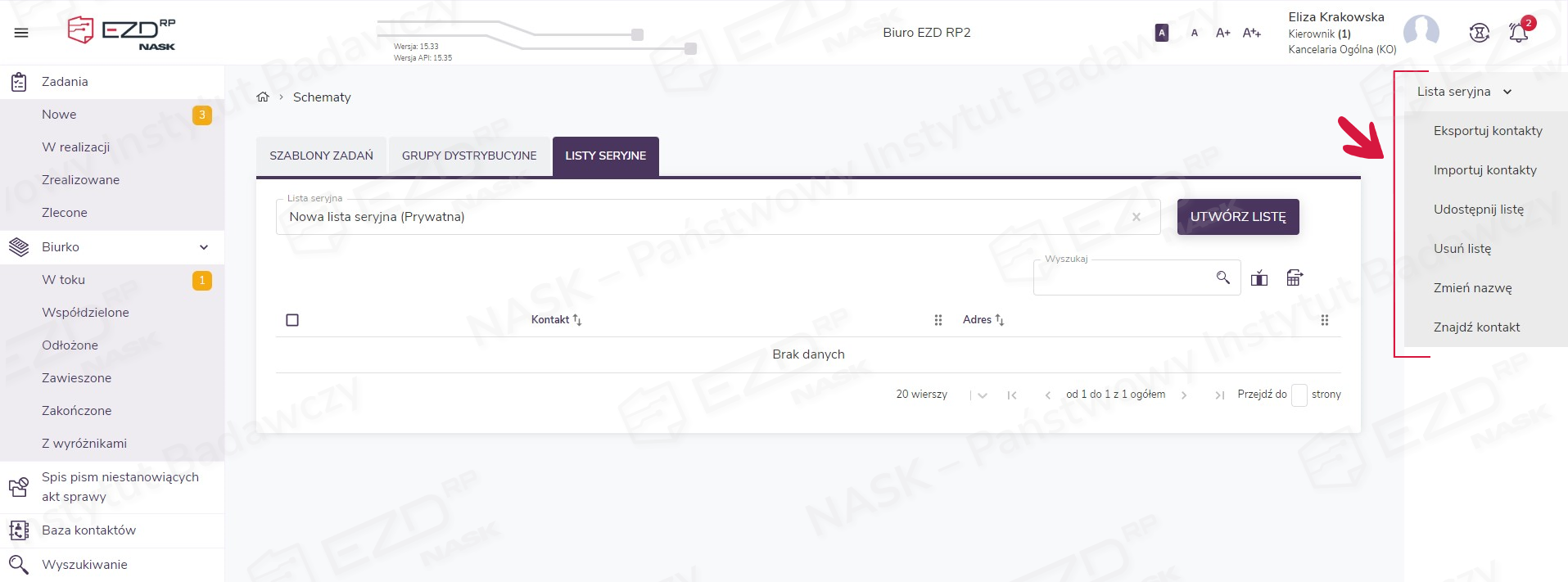System EZD RP daje użytkownikom możliwość tworzenia stanowiących zbiory kontaktów list seryjnych. Taka lista może zostać wykorzystana podczas przygotowywania wysyłek do większej liczby odbiorców. Domyślnie jest ona widoczna wyłącznie dla użytkownika, który ją utworzył, jednak może zostać udostępniona również innym pracownikom organizacji.