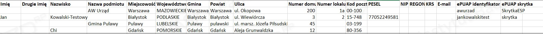 Użytkownik może samodzielnie importować kontakty. Aby to zrobić, należy w arkuszu kalkulacyjnym stworzyć listę z danymi potrzebnymi do zaadresowania kopert. Wprowadzane informacje należy umieszczać w odpowiednich kolumnach, takich jak w udostępnionym szablonie do importu kontaktów.