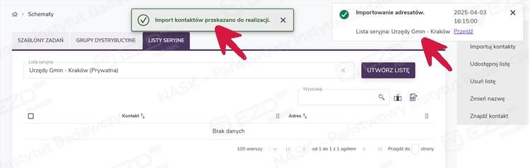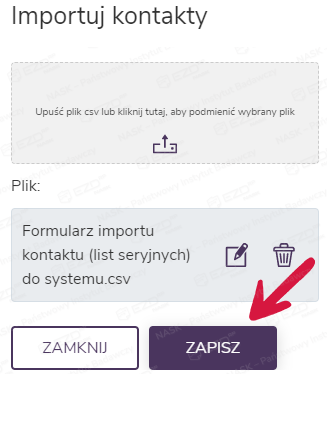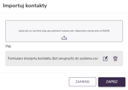 Import przygotowanej listy seryjnej wykonujemy po wybraniu z prawego menu opcji Lista seryjna > Importuj kontakty. Dodajemy przygotowany plik CSV i wybieramy opcję Zapisz.