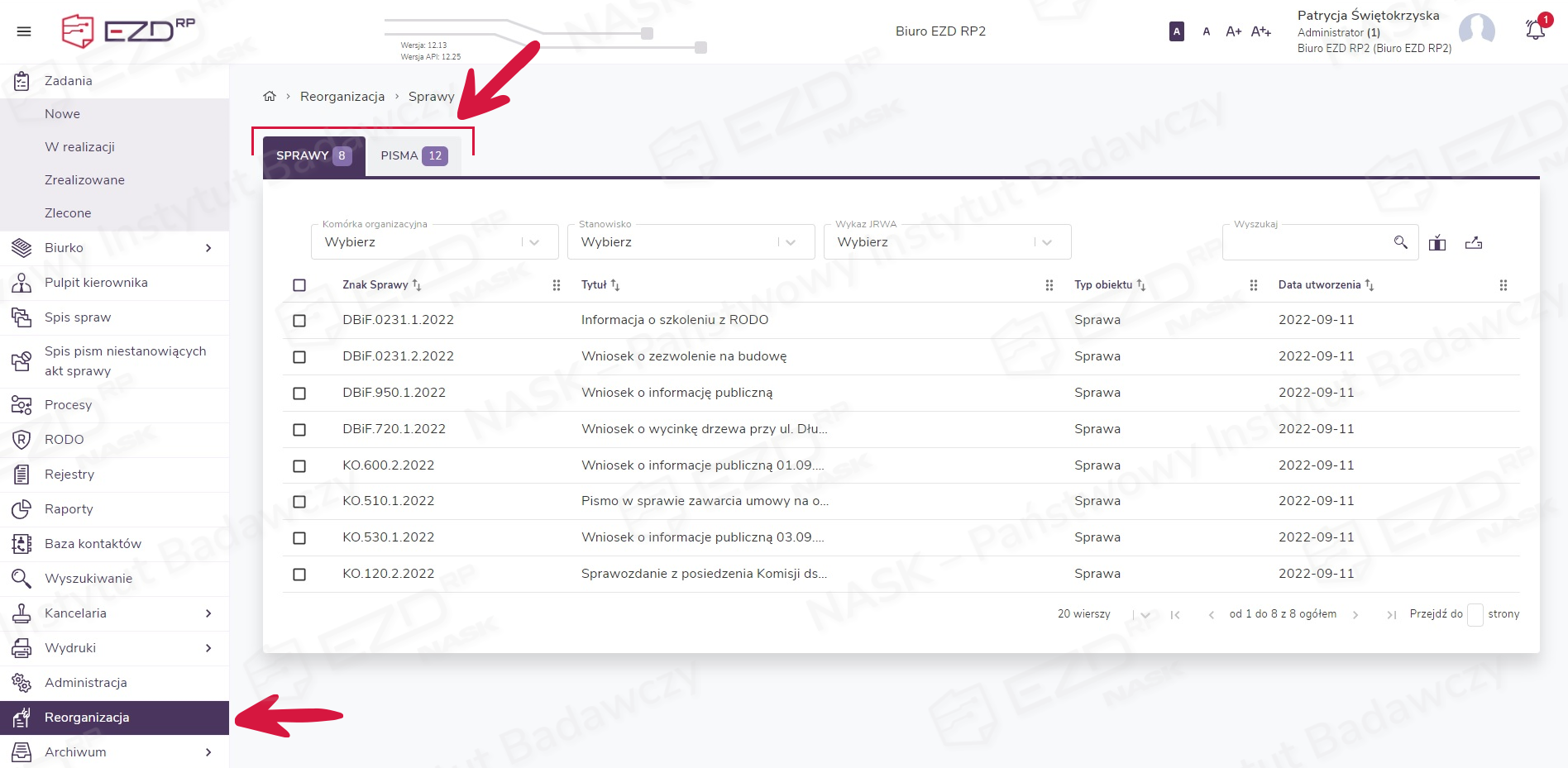 Do modułu Reorganizacja trafiają niezakończone sprawy i pisma znajdujące się na biurkach pracowników usuwanych ze struktury organizacyjnej oraz biurkach pracowników komórek organizacyjnych podlegających reorganizacji w instytucji. Po kliknięciu modułu Reorganizacja w menu głównym wyświetlony zostaje widok, w którym dostępne są dwie zakładki: Sprawy oraz Pisma.