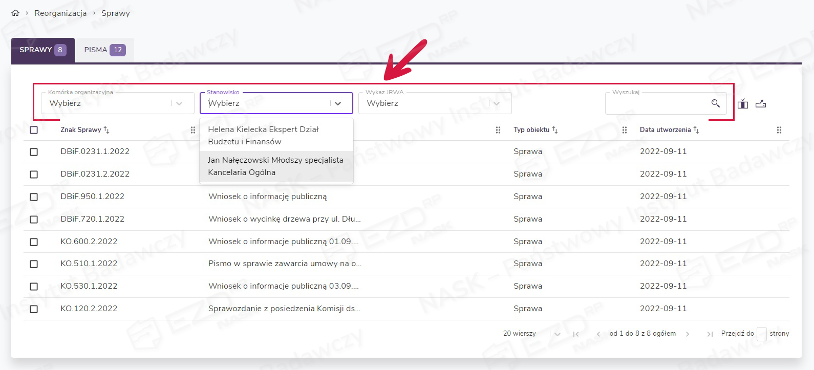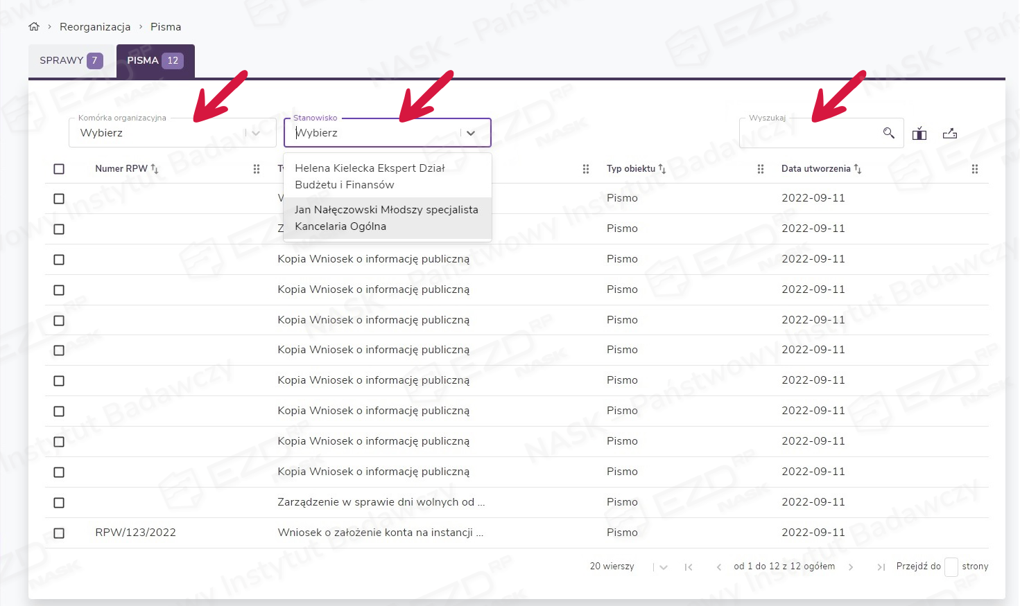Druga zakładka w module Reorganizacja to Pisma. Po jej kliknięciu możliwe jest wskazanie nowych właścicieli dla niezakończonych pism wpływających zarejestrowanych w rejestrze przesyłek wpływających (RPW) i pism w toku nierejestrowanych w RPW, znajdujących się na biurkach usuniętych użytkowników. Możliwe jest filtrowanie pism za pomocą pól Komórka organizacyjna lub Stanowisko. Dostępna jest również wyszukiwarka – pole Wyszukaj z ikoną lupy.