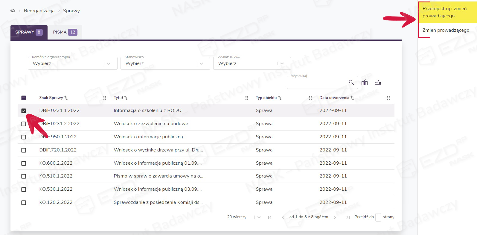 Zaznaczenie pola wyboru przy znaku sprawy powoduje wyświetlenie menu kontekstowego z prawej strony ekranu, gdzie dostępne są dwie opcje: Przerejestruj i zmień prowadzącego i Zmień prowadzącego.