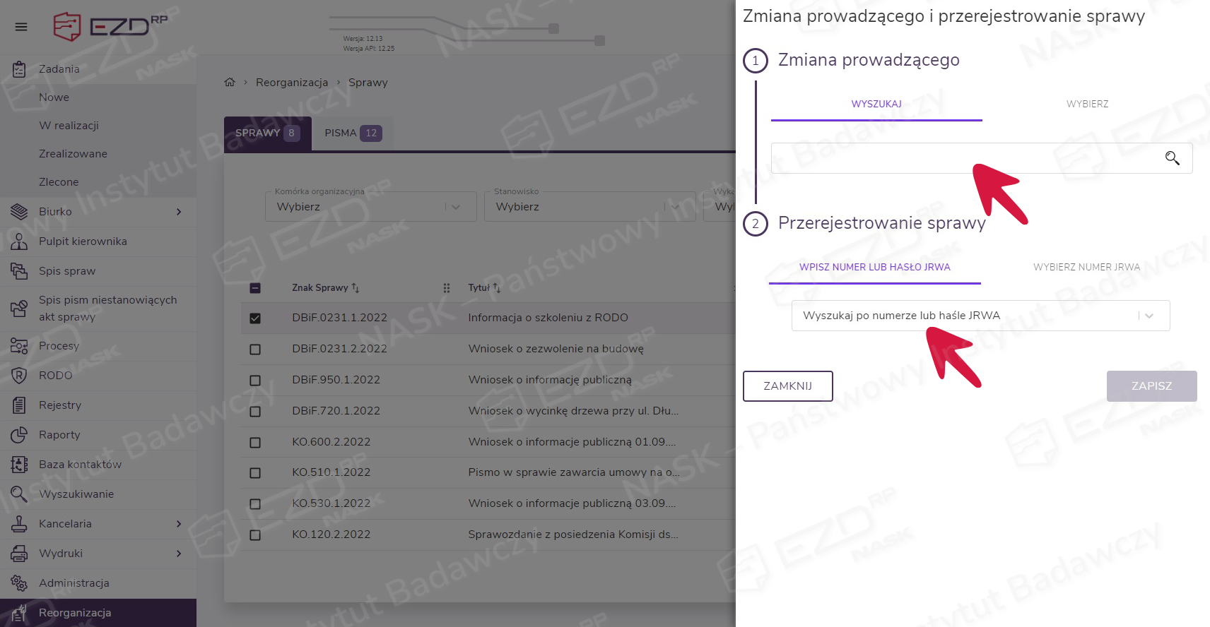 W kolejnym kroku należy wskazać nową klasę JRWA dla wybranej sprawy, wpisując numer lub hasło JRWA w polu wyszukiwania bądź wybierając klasę końcową ze schematu jednolitego rzeczowego wykazu akt. Po wykonaniu tych czynności zatwierdzamy zmiany, klikając przycisk Zapisz.