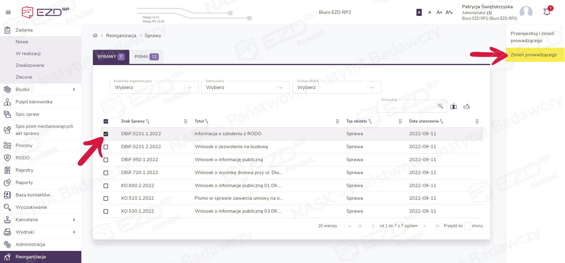 Aby wskazać osobę, do której trafi dane pismo, należy zaznaczyć pole wyboru przy wybranym piśmie, a następnie w menu z prawej strony ekranu kliknąć opcję Wybierz nowego właściciela.