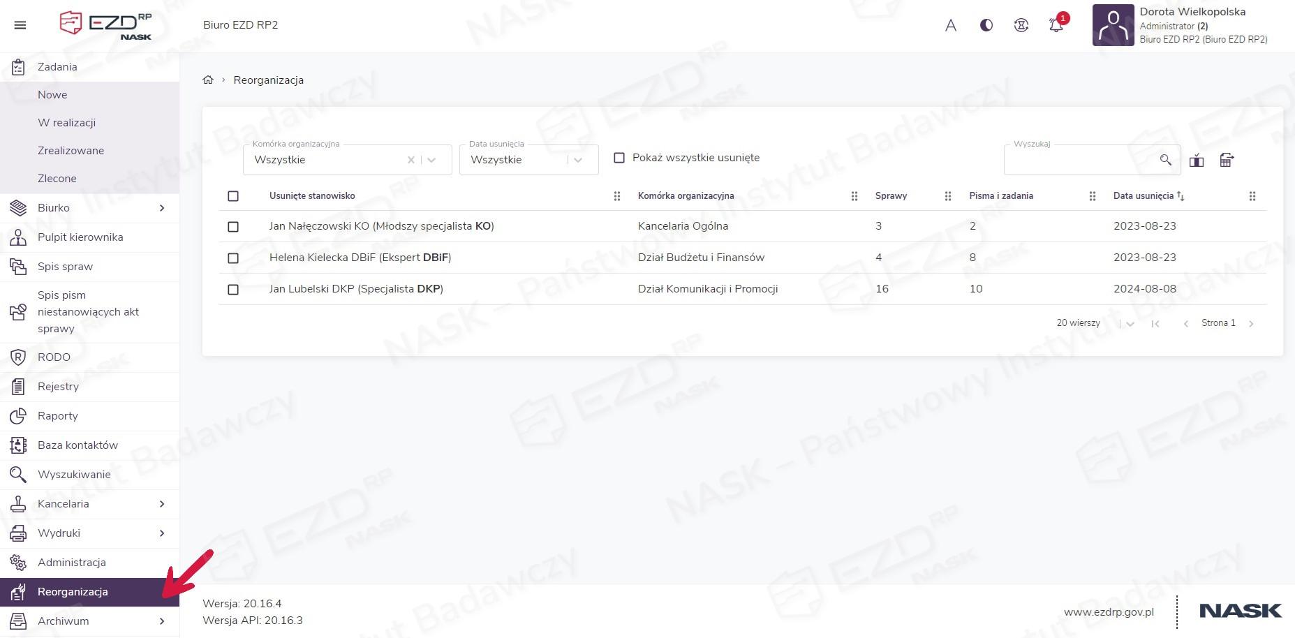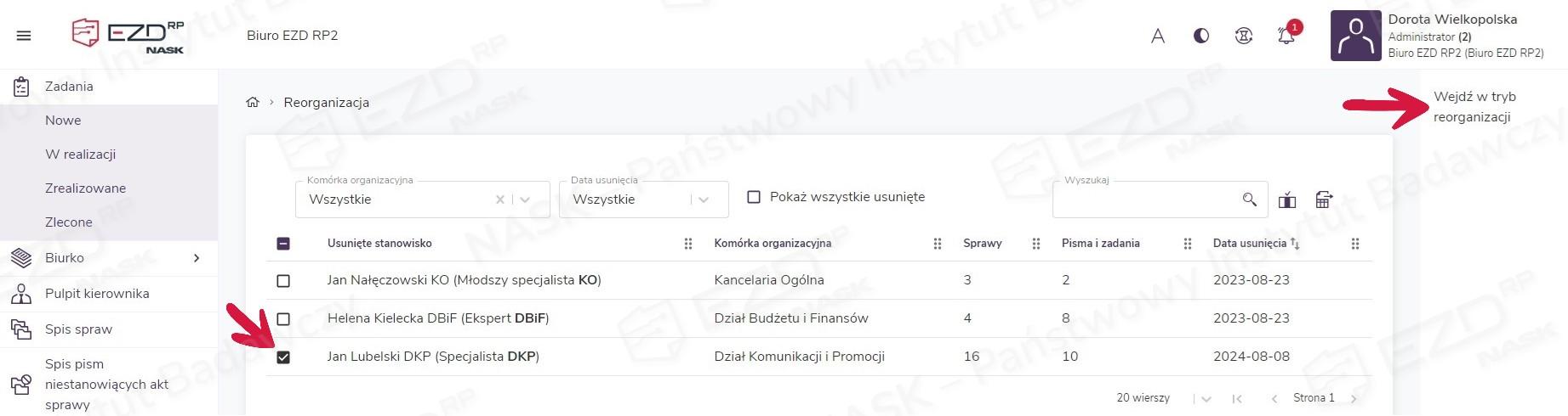 Moduł Reorganizacja to miejsce, w którym uprawniona do tego osoba ma dostęp do listy usuniętych stanowisk. W miejscu tym można też zarządzać znajdującymi się na zlikwidowanych kontach sprawami i pismami.