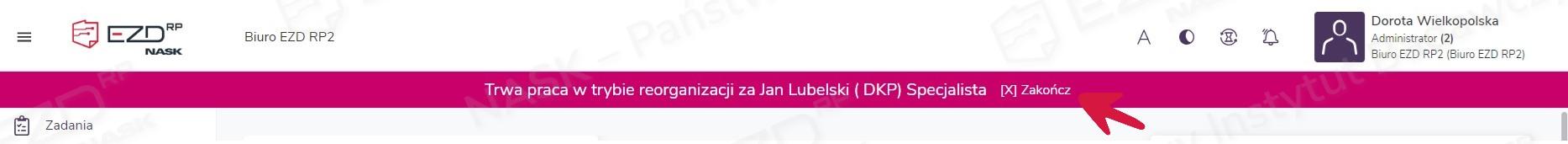 Pasek w górnej części systemu informuje, że praca wykonywana jest w trybie reorganizacji. Aby z tego trybu wyjść, należy kliknąć Zakończ.