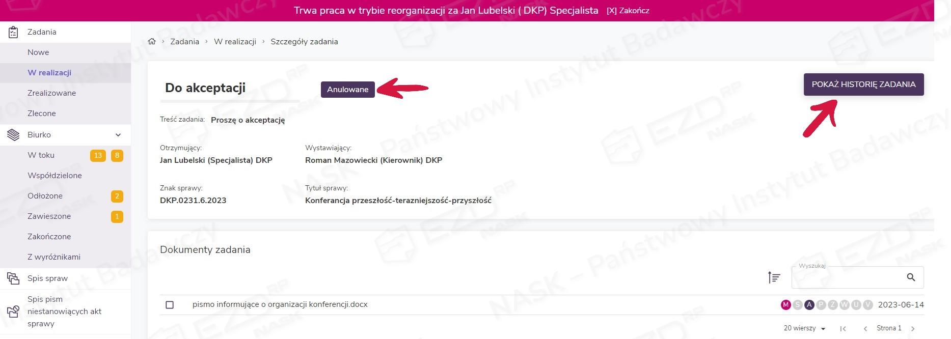 W module Zadania widoczne są te zadania, które zostały użytkownikowi wystawione, a których nie zakończył przed usunięciem stanowiska. Wszystkie one mają status Anulowane, o czym można przekonać się po wejściu w ich szczegóły. Jedyną możliwą do wykonania akcją jest zapoznanie się z historią zadania.