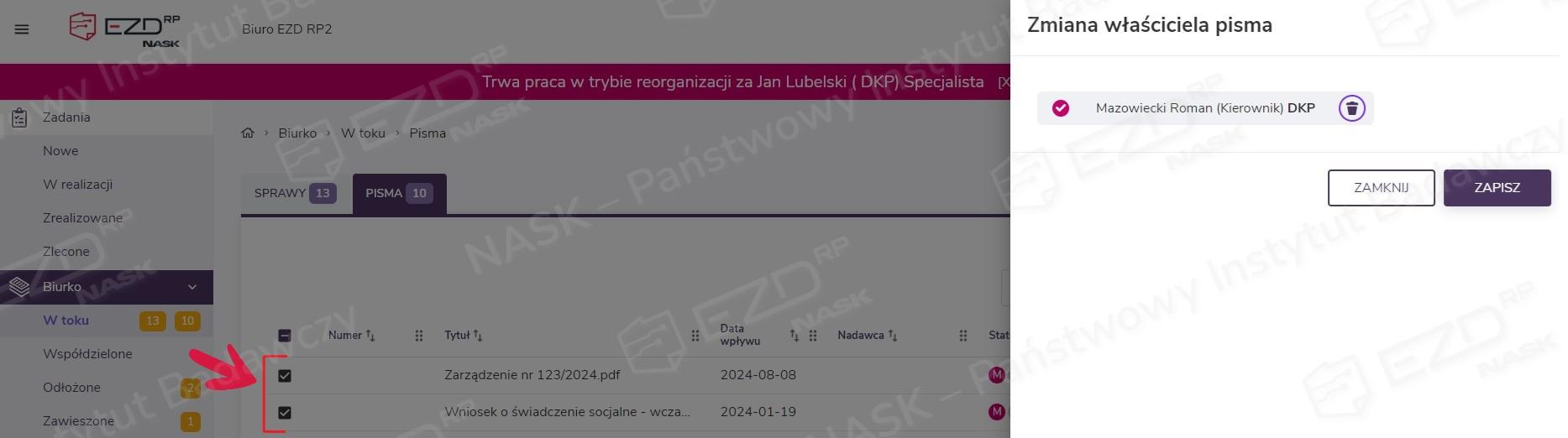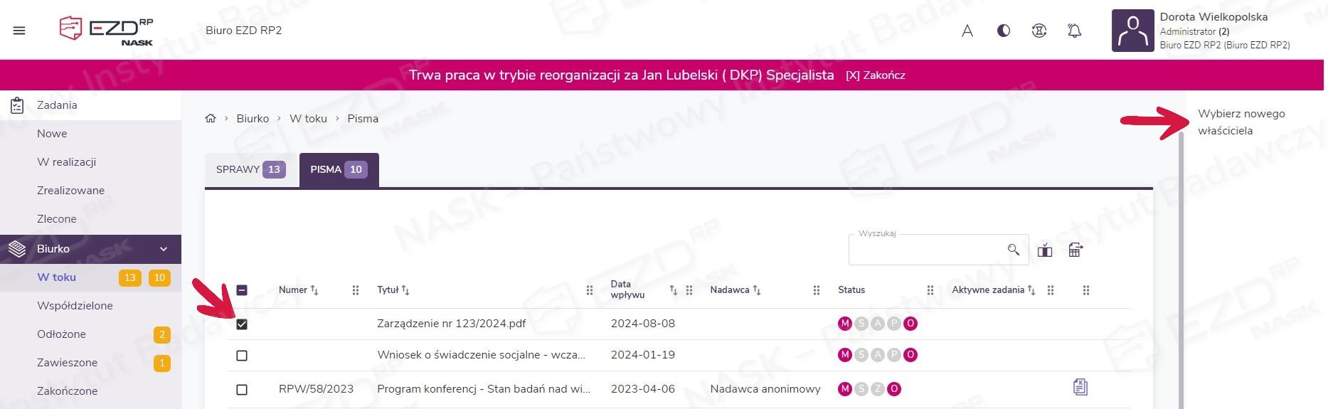 Na koncie podlegającym reorganizacji, w zakładce Biurko > W toku > Pisma, widoczne są wszystkie pisma – zarówno te z RPW, jak i wewnętrzne – które nie zostały zakończone. Zaznaczenie pola wyboru przy dokumencie powoduje wyświetlenie z prawej strony opcji Wybierz nowego właściciela.