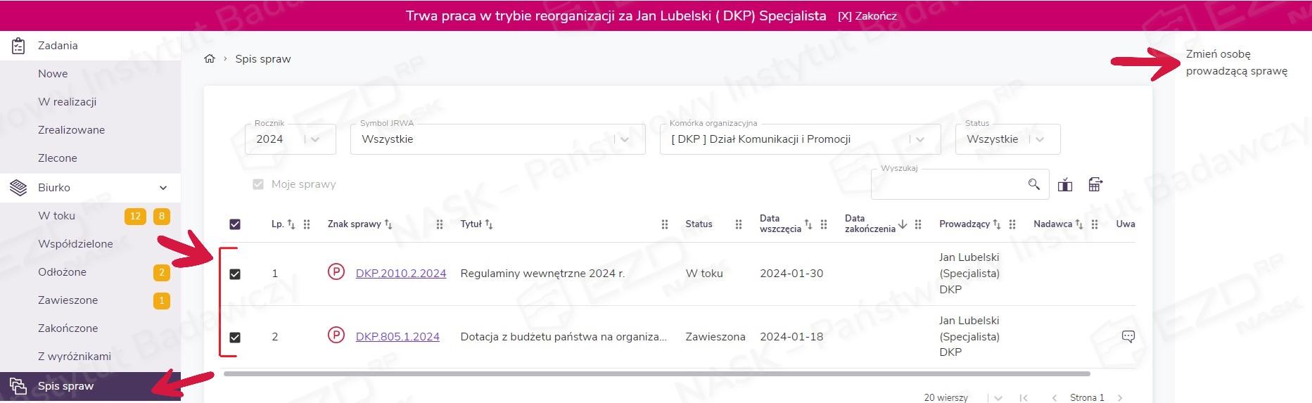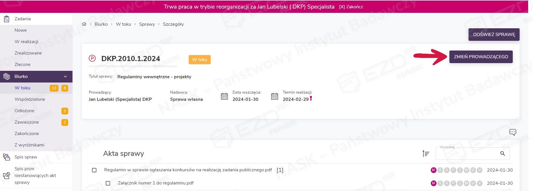 Pracując w trybie reorganizacji, można również wskazać nowego właściciela dla spraw, które nie zostały zakończone przed likwidacją stanowiska. Ich lista znajduje się w Biurku w zakładce Sprawy. Klikając podlinkowany znak sprawy, można wejść do jej wnętrza, gdzie w prawym górnym rogu dostępny jest przycisk Zmień prowadzącego.