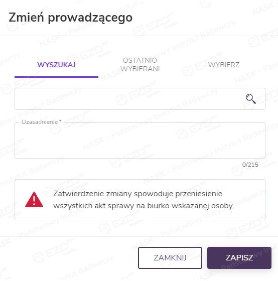 Kliknięcie przycisku powoduje otwarcie okna, w którym należy wskazać nową osobę prowadzącą sprawę oraz wpisać uzasadnienie. Po zatwierdzeniu wyboru – zgodnie z informacją – akta sprawy zostaną przeniesione do Biurka tej osoby.