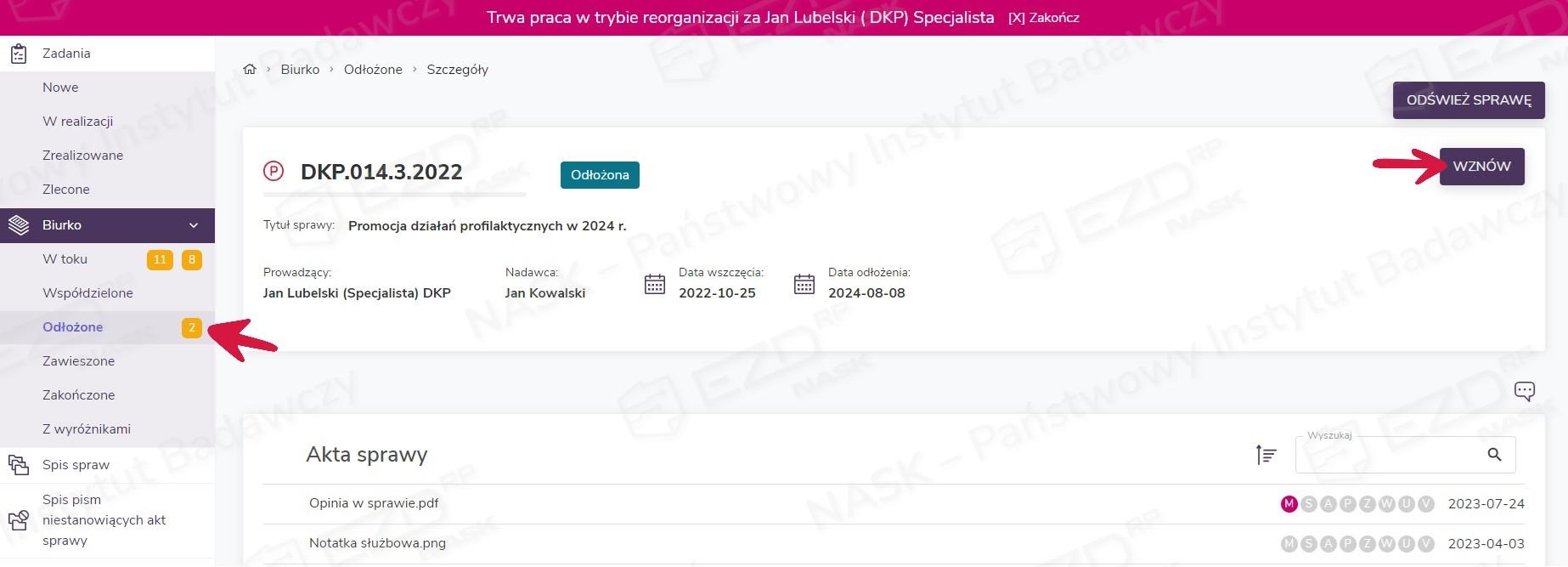 Wznowienie przez osobę przeprowadzającą reorganizację nie jest możliwe w przypadku spraw zakończonych. Czynność tę będzie mógł wykonać nowy właściciel sprawy.