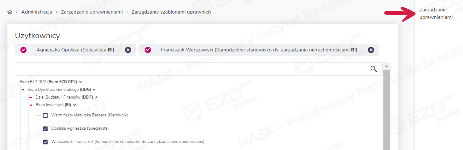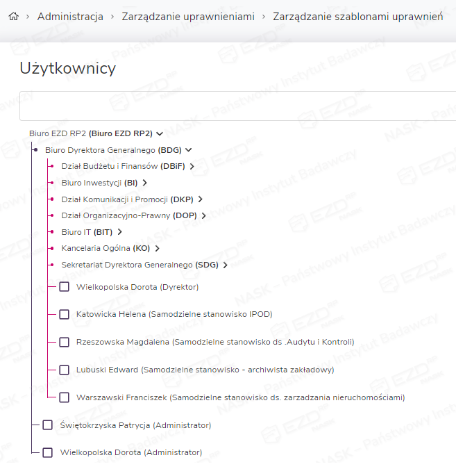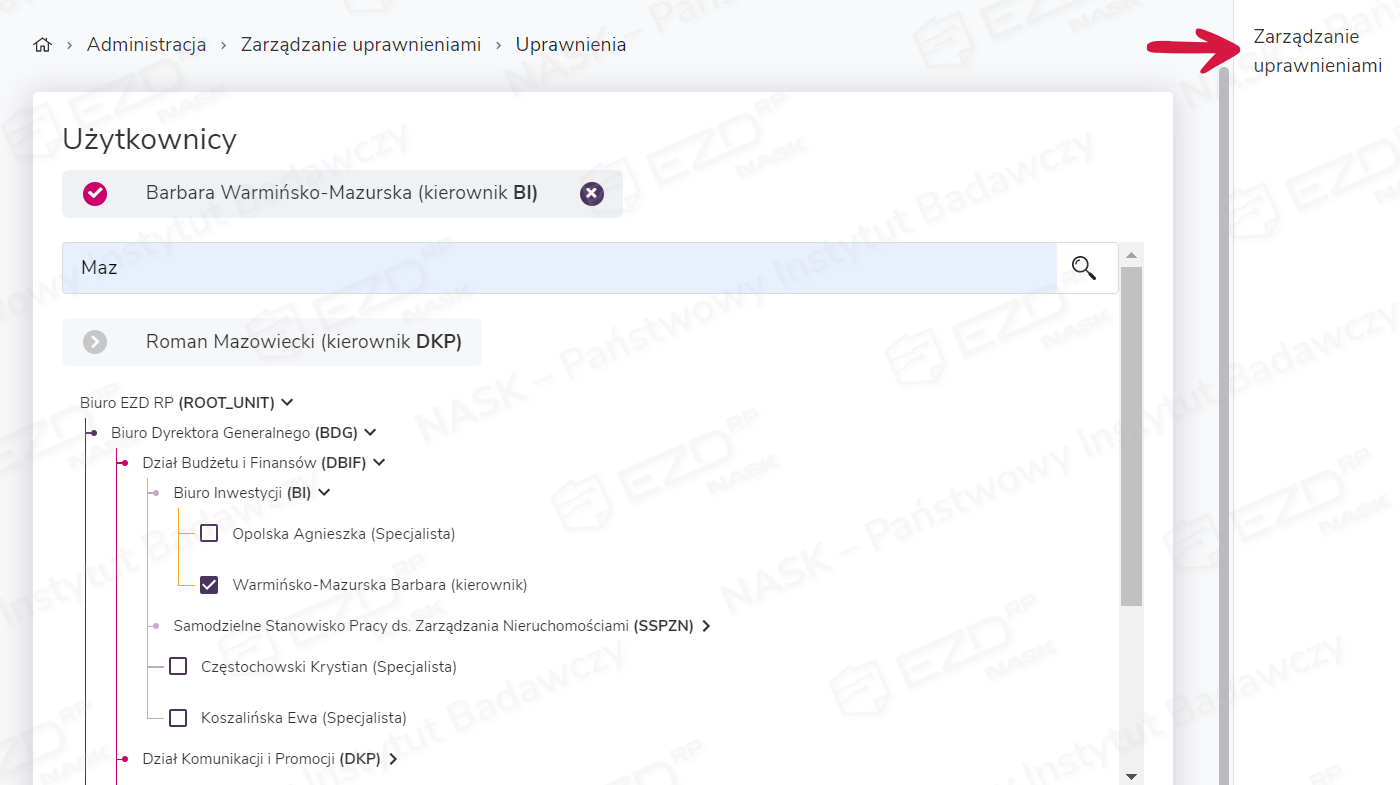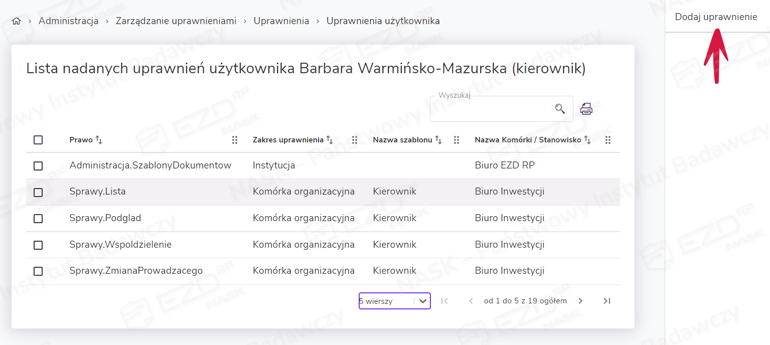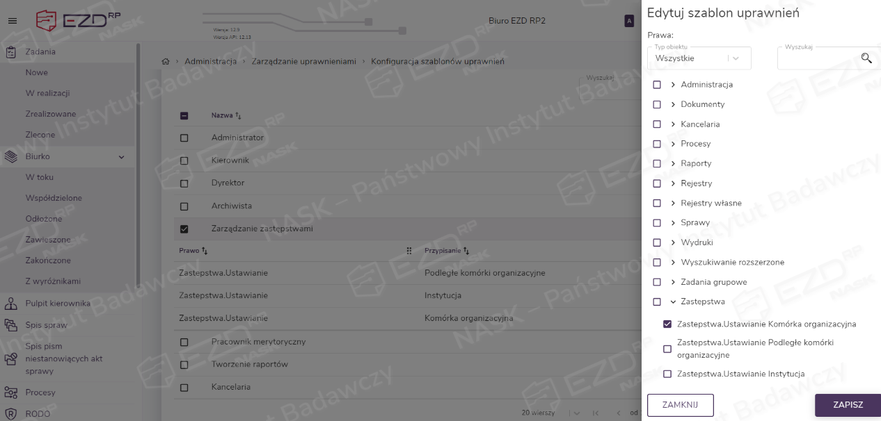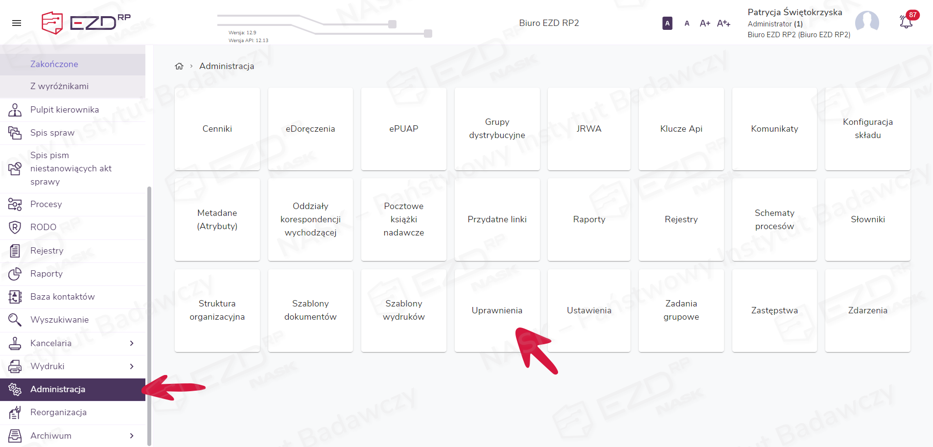 W systemie EZD RP opcje zarządzania uprawnieniami do wykonywania konkretnych zadań są dostępne w module Administracja.
