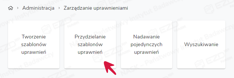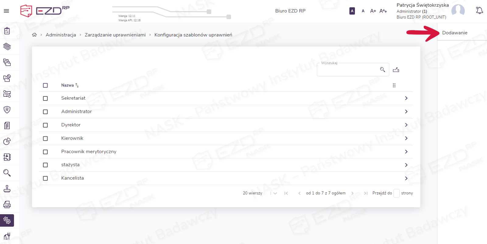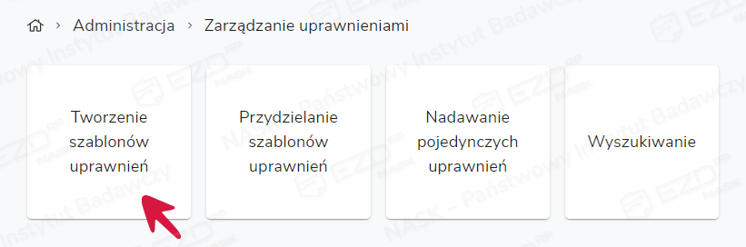 W celu utworzenia nowego szablonu administrator klika kafelek Tworzenie szablonów uprawnień, a następnie opcję Dodawanie w menu kontekstowym z prawej strony ekranu.