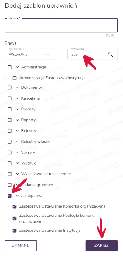Wyświetli się panel boczny Dodaj szablon uprawnień, w którym mamy możliwość wybrania pojedynczego prawa lub grup praw. Listę można ograniczyć do danego kryterium, wprowadzając w pole Wyszukaj początkowe litery uprawnienia lub wybierając je z listy Typ obiektu poprzez rozwinięcie drzewa struktury. Następnie należy wpisać nazwę nowego szablonu, np. Dyrektor, Kancelaria, Tworzenie raportów. Wprowadzone zmiany zatwierdzamy przyciskiem Zapisz. Utworzony szablon zostanie wyświetlony na liście.