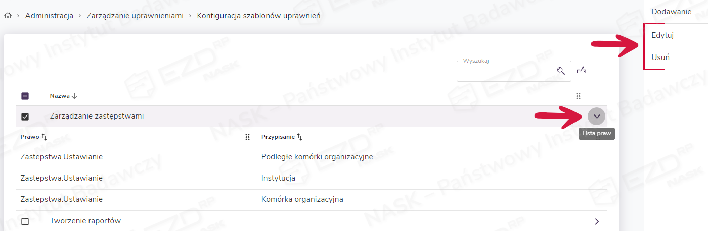 Po zaznaczeniu pola wyboru przy pojedynczym szablonie z listy w menu kontekstowym pojawią się opcje: Edytuj i Usuń. Kliknięcie symbolu rozwinięcia wyświetla listę praw przypisanych do danego szablonu.