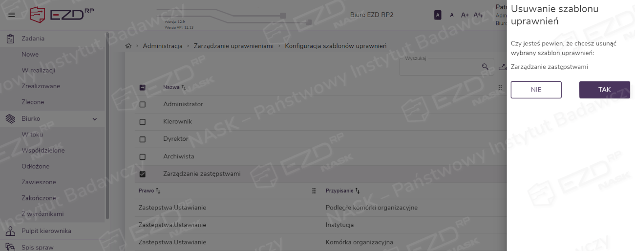 Z kolei wskazanie przez administratora w menu kontekstowym opcji Usuń wyświetla panel boczny Usuwanie szablonu uprawnień z komunikatem, w którym potwierdzamy potrzebę usunięcia uprawnienia. Czynność zatwierdzamy przyciskiem Tak. Spowoduje to usunięcie szablonu z listy i zabranie praw użytkownikom, którzy otrzymali uprawnienia za pomocą tego szablonu.