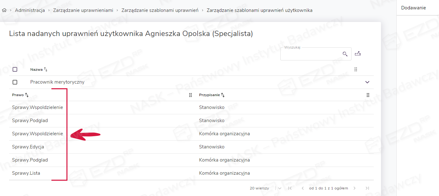 - Wyszukiwanie – weryfikacja, jakie prawa zostały przypisane do danego użytkownika.