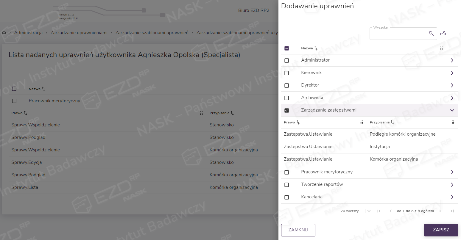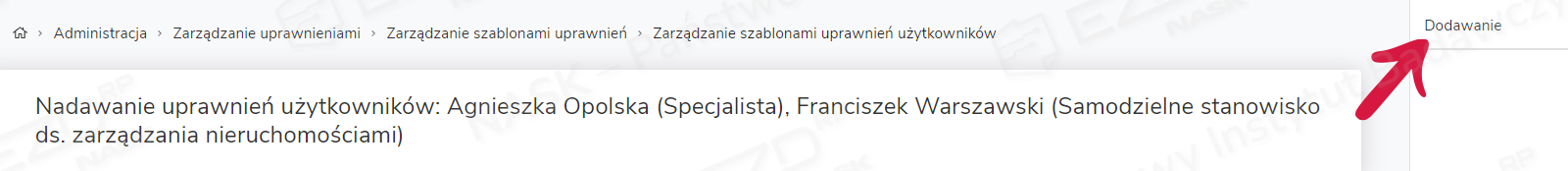Kliknięcie w menu kontekstowym opcji Dodawanie spowoduje wyświetlenie panelu bocznego Dodawanie uprawnień. Rozwinięcie danego szablonu wyświetli przypisane do niego prawa i zakres działania. Administrator zaznacza pole wyboru przy nazwie szablonu i klika przycisk Zapisz. Po zatwierdzeniu zmian przypisane zostaną wybranym użytkownikom uprawnienia z danego szablonu.