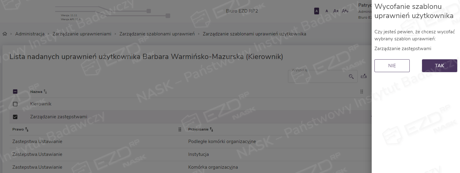 Jeżeli chcemy usunąć dany zestaw uprawnień (szablon) z konta danego użytkownika, z drzewa struktury wybieramy jego nazwisko, klikamy Zarządzanie uprawnieniami oraz zaznaczamy pole wyboru przy szablonie, który chcemy odebrać. W menu kontekstowym pojawi się funkcja Usuń – po jej kliknięciu wyświetli się panel boczny Wycofanie szablonu uprawnień użytkownika. Klikamy przycisk Tak. Zapisanie zmian spowoduje zabranie użytkownikowi uprawnień przypisanych do danego szablonu.