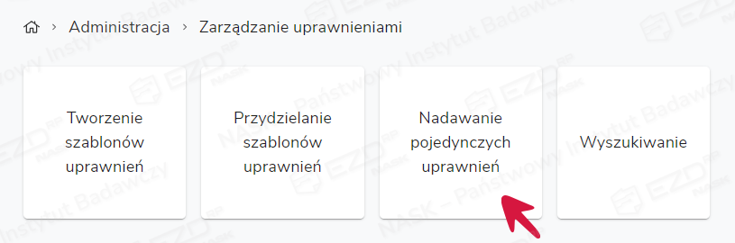 Aby przydzielić użytkownikom dodatkowe prawa, należy kliknąć kafelek Nadawanie pojedynczych uprawnień. Administrator może wyszukać użytkowników za pomocą wyszukiwarki lub rozwinąć drzewo struktury i zaznaczyć pole wyboru przy nazwisku. W menu kontekstowym pojawi się funkcja Zarządzanie uprawnieniami.