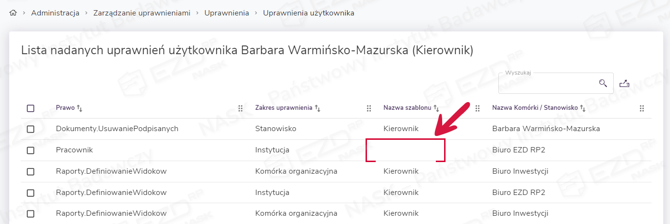 Po kliknięciu funkcji wyświetli się widok Lista nadanych uprawnień użytkownika, gdzie możemy zobaczyć wszystkie przydzielone prawa – zarówno z szablonów uprawnień i nadane użytkownikowi dodatkowo. Brak nazwy szablonu przy uprawnieniu oznacza, że zostało ono nadane pojedynczo.