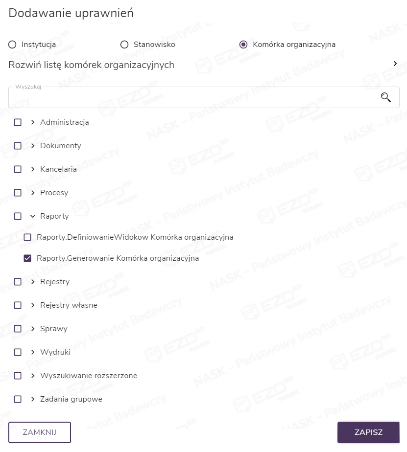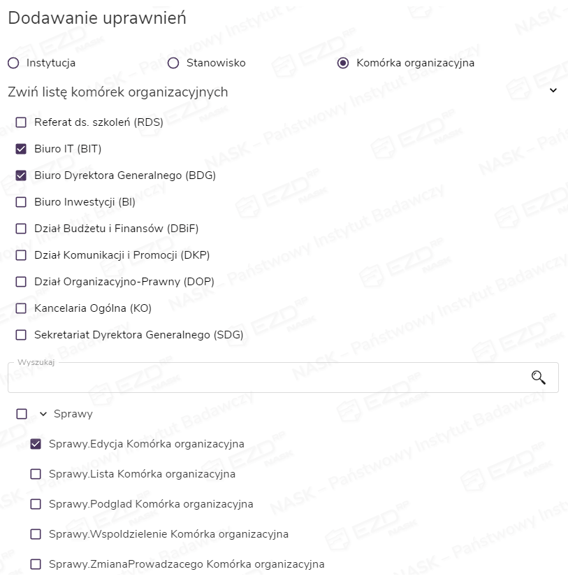 Po kliknięciu opcji Dodaj uprawnienie wyświetli się panel boczny Dodawanie uprawnień. Tak jak wspomniano na początku artykułu, w zależności od zasięgu uprawnienia zostały podzielone na typy obiektów: Instytucja, Stanowisko, Komórka organizacyjna. Zaznaczając odpowiednie pole wyboru, administrator ma możliwość wyświetlenia praw przypisanych do danego typu obiektu. Ma on również możliwość ograniczenia listy do zadanego kryterium poprzez wpisanie fragmentu jego nazwy w polu Wyszukaj.