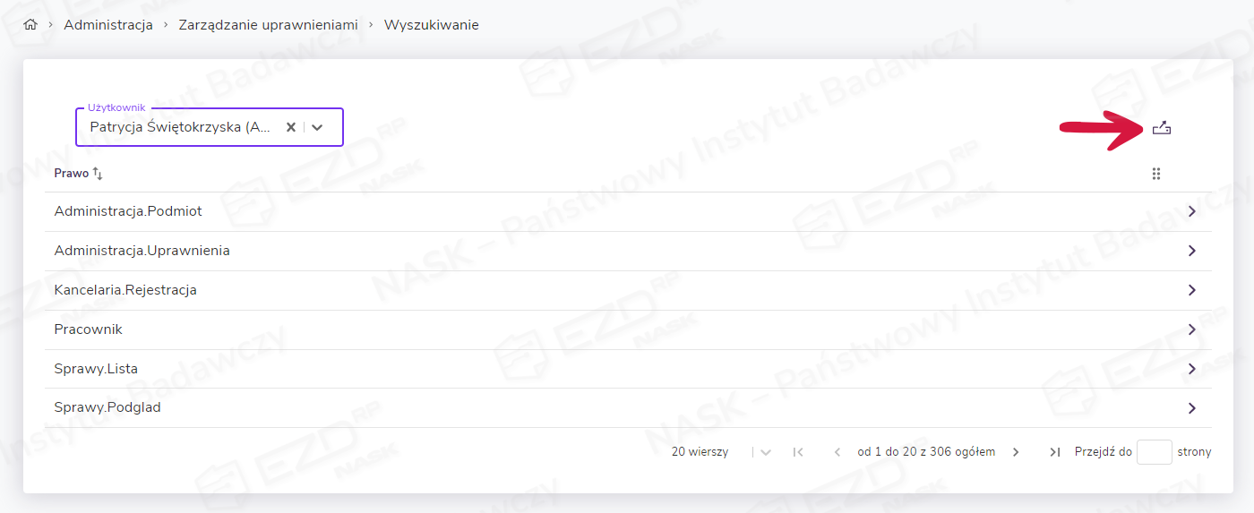 Wyświetlenie oraz wydrukowanie przypisanych danemu użytkownikowi uprawnień z szablonów i praw nadanych dodatkowo jest możliwe po kliknięciu kafelka Wyszukiwanie. Po użyciu ikony eksportu system wygeneruje tabelę z listą uprawnień danego pracownika w pliku w formacie PDF.