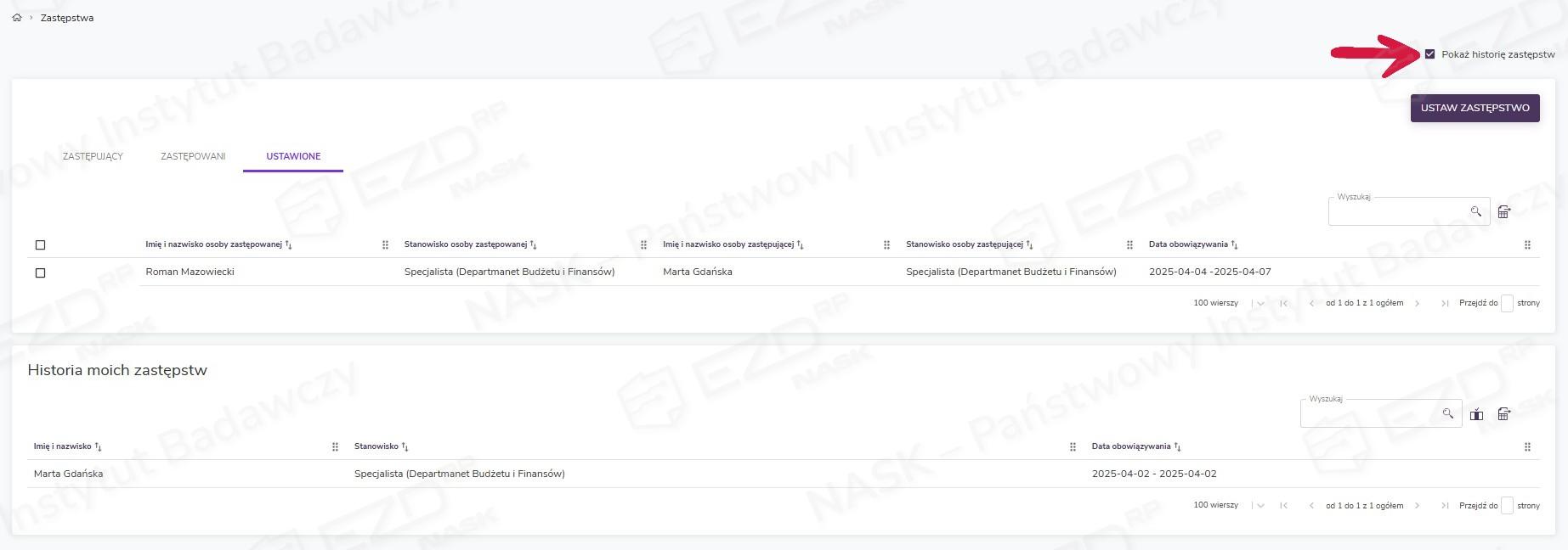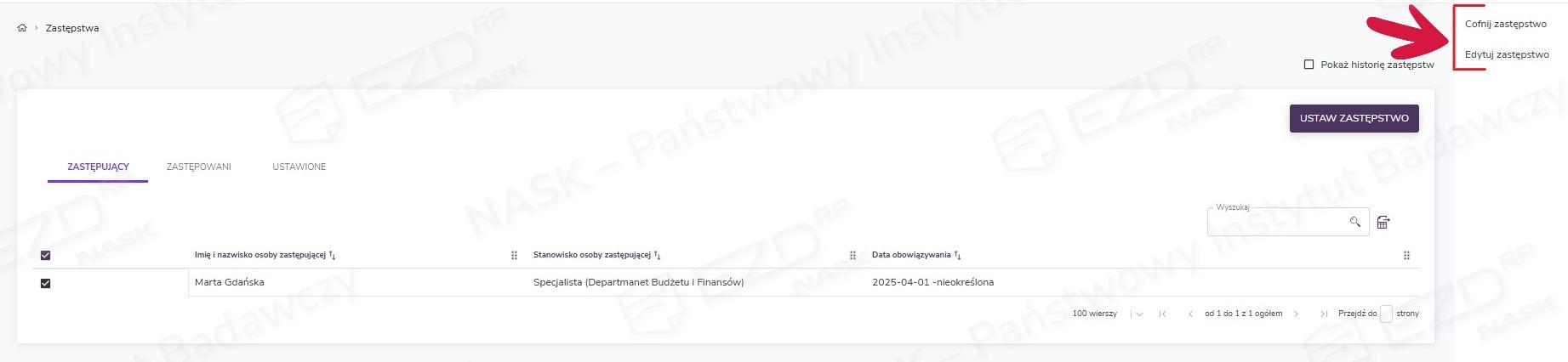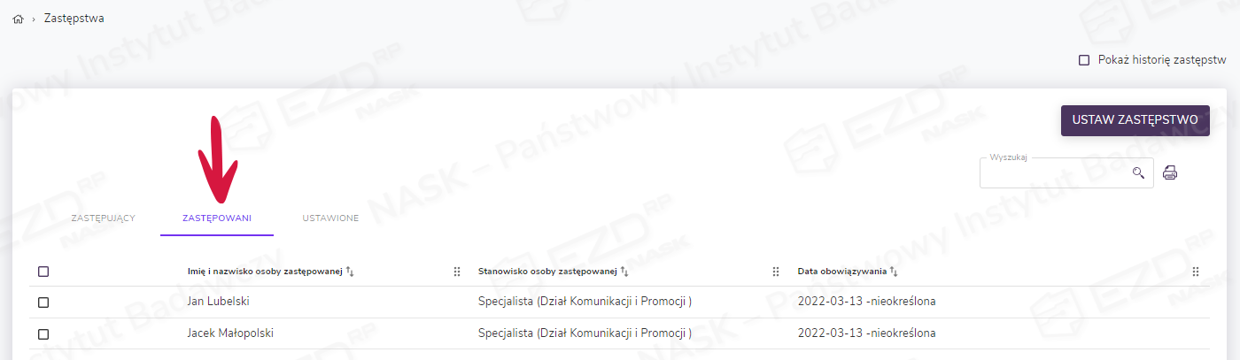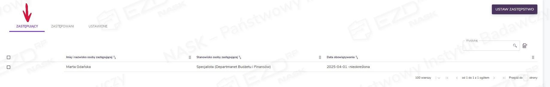W tej sekcji wyświetlane są wszystkie zastępstwa ustawione przez użytkownika. Jeżeli użytkownik ma nadane dodatkowe uprawnienia, będzie widział również zastępstwa ustawione na siebie.