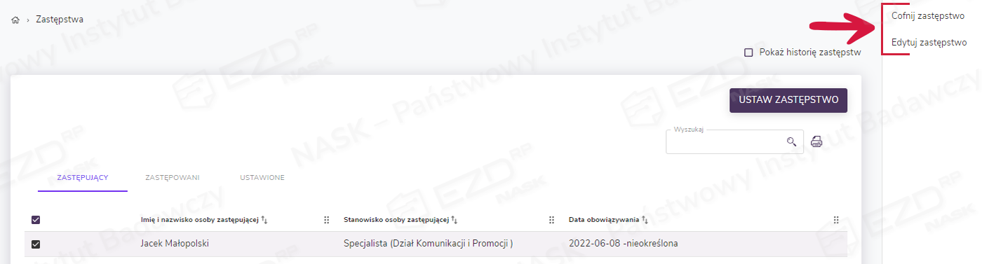 Zaznaczenie pola wyboru przy nazwisku osoby zastępującej spowoduje wyświetlenie się prawego menu z dwiema opcjami: Cofnij zastępstwo oraz Edytuj zastępstwo.