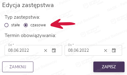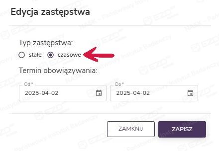 Z kolei po kliknięciu przycisku Edytuj zastępstwo wyświetlone zostaje okno, które pozwala na wybranie zastępstwa stałego lub czasowego. W przypadku tego drugiego możemy dodać termin obowiązywania zastępstwa. Po zapisaniu wprowadzonych zmian zostanie wysłana wiadomość e-mail do pracownika, którego one dotyczą.