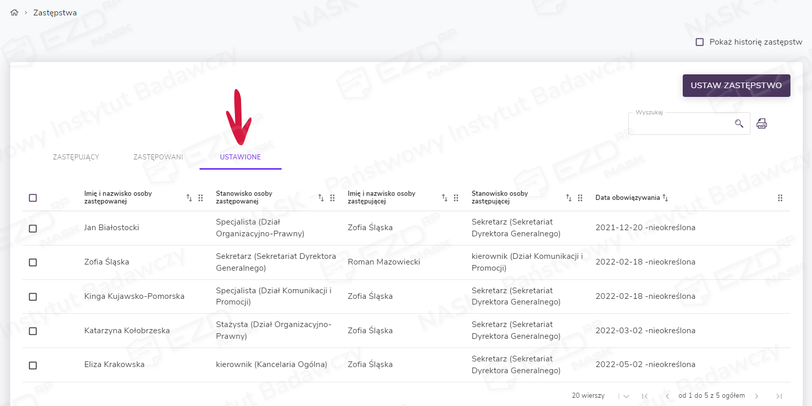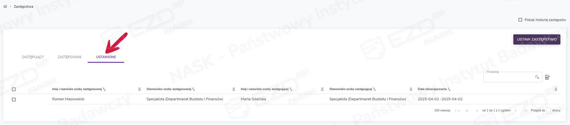 Po kliknięciu tej opcji wyświetla się lista zastępstw podzielona na trzy sekcje: Zastępujący, Zastępowani, Ustawione.