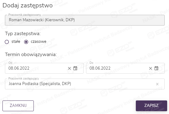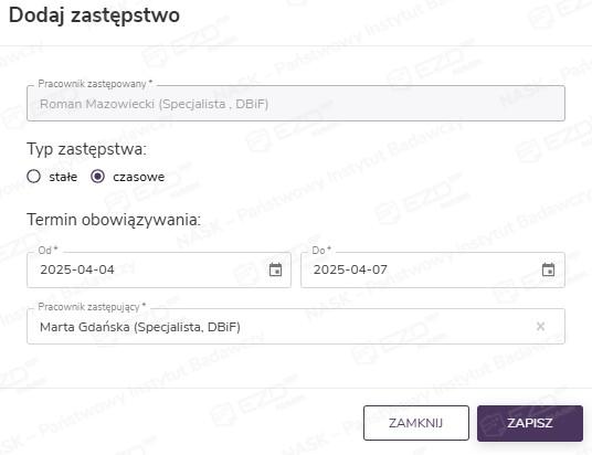 Z kolei po wybraniu zastępstwa czasowego, najpierw należy wskazać termin obowiązywania zastępstwa. Następnie wybieramy z listy pracownika zastępującego. Kliknięcie przycisku Zapisz spowoduje zapisanie zastępstwa oraz wysłanie do pracownika wiadomości e-mail z powiadomieniem o wprowadzonych zmianach.
