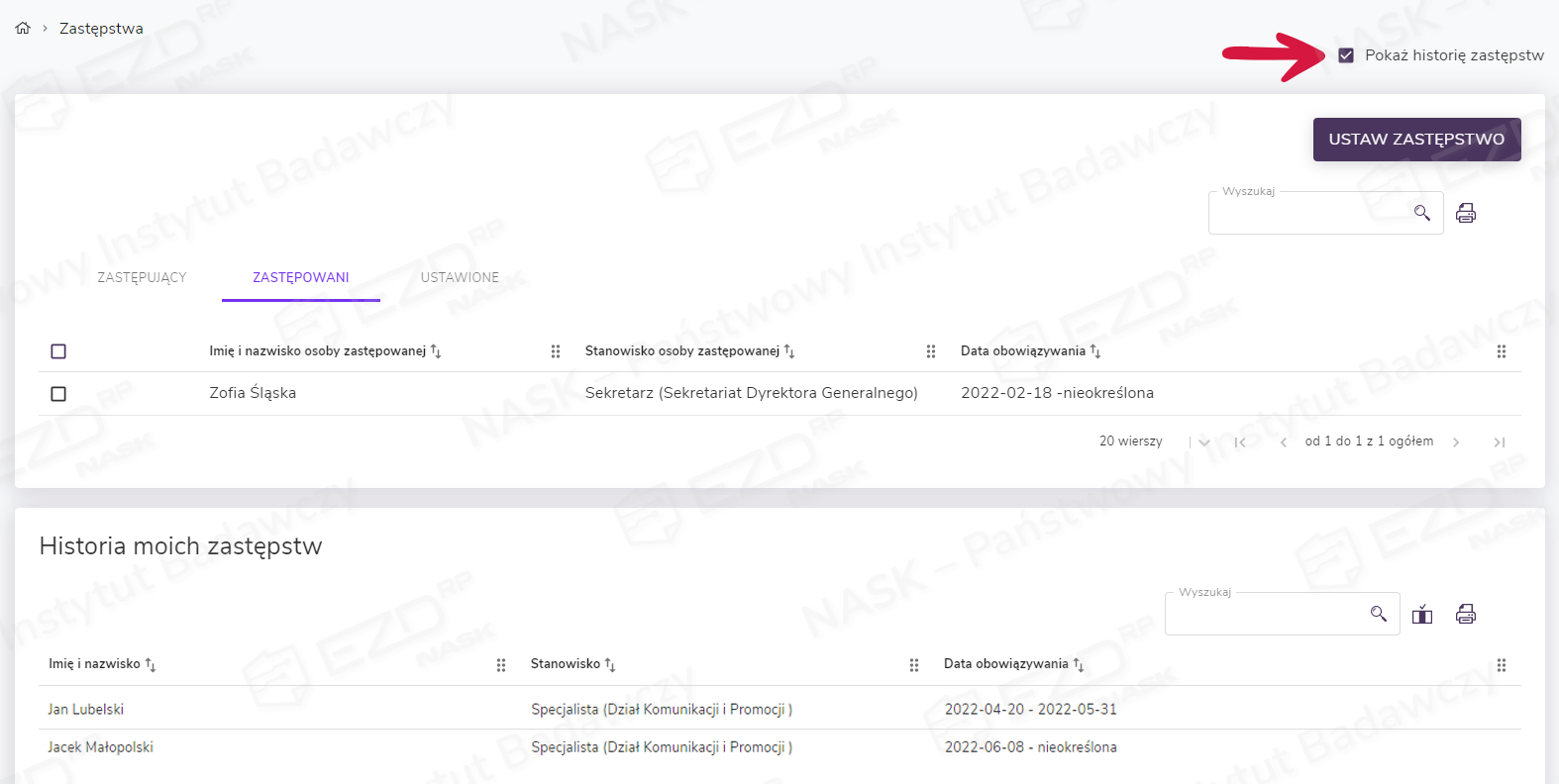 Użytkownik w każdej chwili może sprawdzić historię zastępstw, która zostanie wyświetlona w dodatkowym oknie. Aby ją zobaczyć, należy kliknąć widoczne na górnej belce imię i nazwisko zalogowanego użytkownika, wybrać z menu opcję Zastępstwa, a następnie po wyświetleniu nowego okna, w prawym górnym rogu zaznaczyć pole Pokaż historię zastępstw. Wyświetlana historia zastępstw obejmuje okres trzech ostatnich miesięcy.
