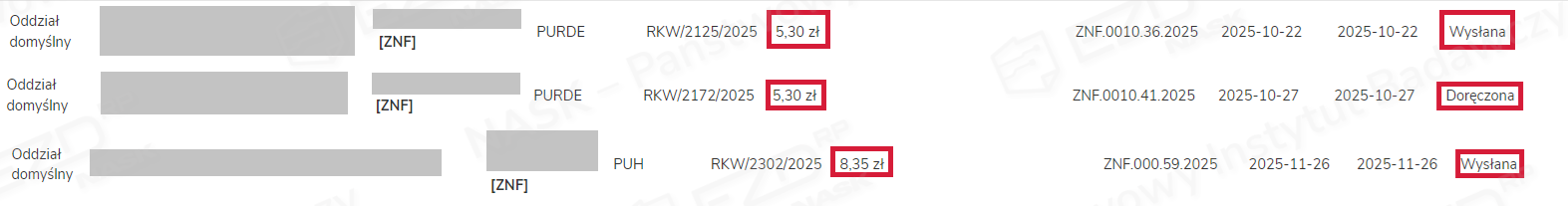 Cena prezentowana jest przy prawidłowo wysłanych lub doręczonych przesyłkach PURDE oraz PUH rejestrowanych.