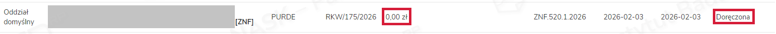 Przesyłka bezkosztowa (0,00 zł), zgodnie z cennikiem operatora wyznaczonego przewidziana jest dla usługi PURDE realizowanej na adres doręczeń elektronicznych podmiotu publicznego.