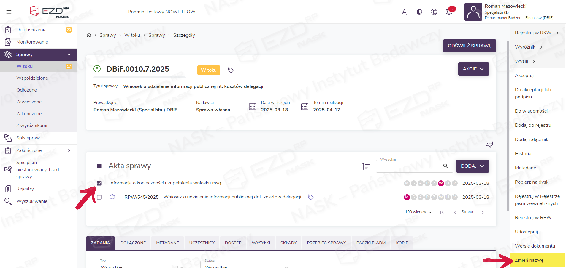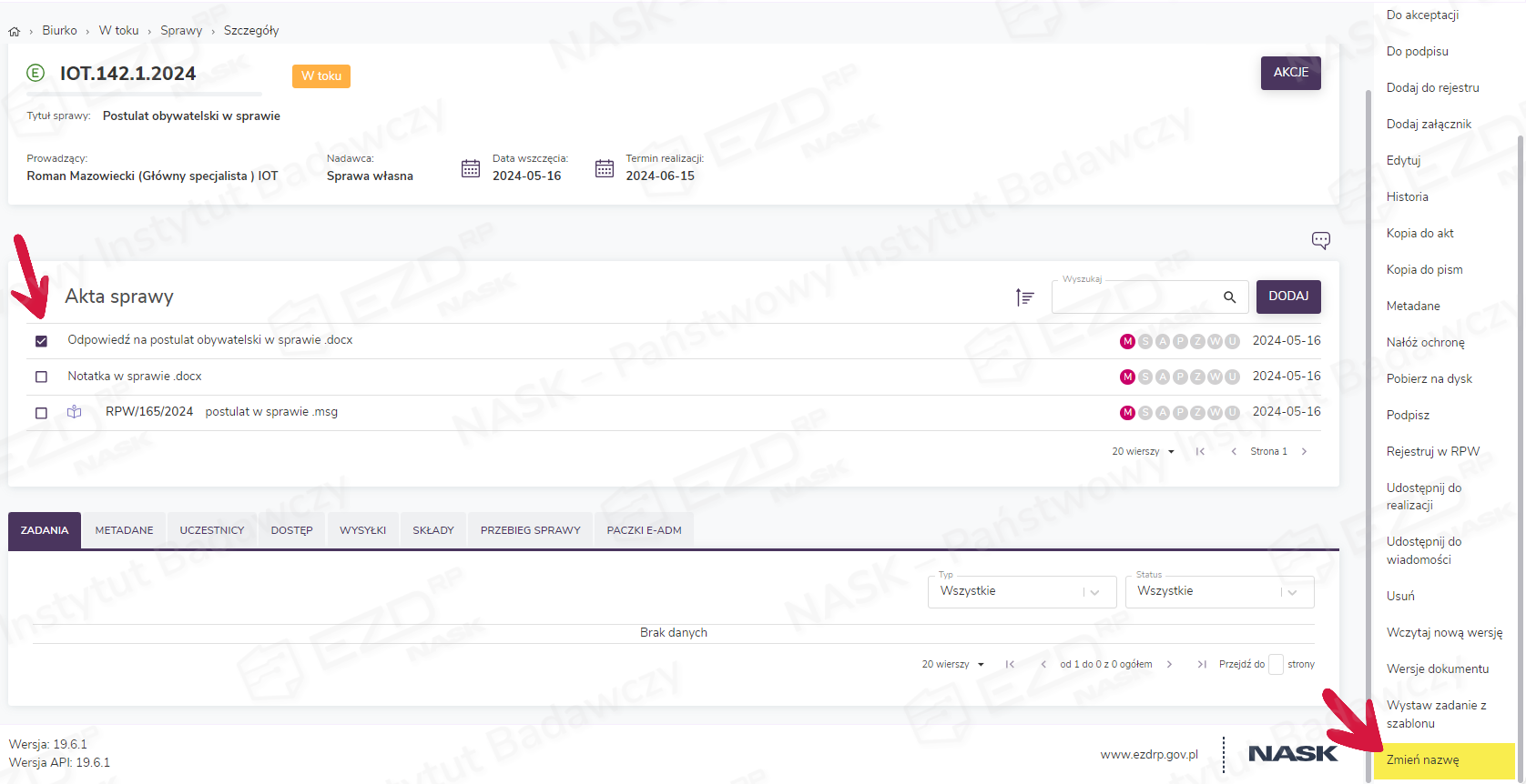 Opcja zmiany nazwy dokumentu dostępna jest w Biurku i dotyczy zarówno dokumentów gromadzonych w Sprawach, jak i w Pismach.
