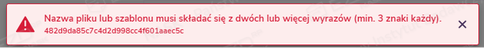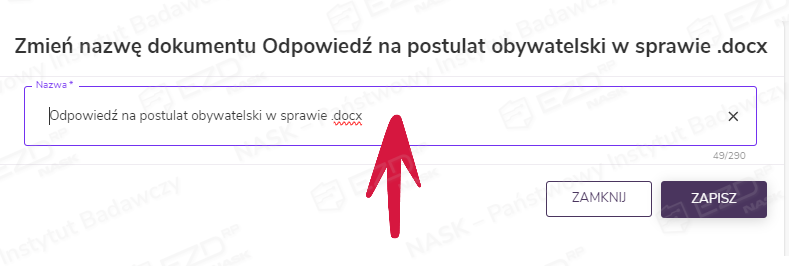 Nazwa dokumentu musi zawierać co najmniej dwa wyrazy (a każdy z nich minimum trzy znaki). Przy próbie nadania nazwy jednowyrazowej system zablokuje możliwość jej zmiany, a na ekranie pojawi się odpowiedni komunikat.