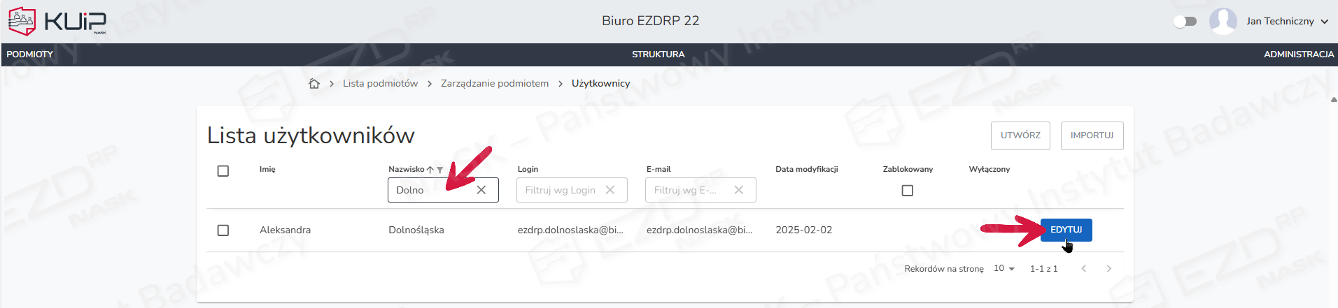 Korektę danych użytkownika, tj. imienia, nazwiska, adresu e-mail lub loginu, można wykonać w programie KUiP (Katalog Usług i Podmiotów), w module Lista podmiotów > Zarządzanie podmiotem > Użytkownicy przy pomocy opcji Edytuj.