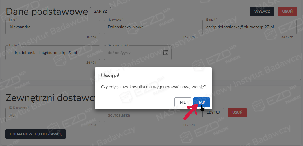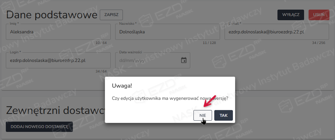 W formularzu Dane podstawowe po wykonaniu korekty imienia lub nazwiska (w zakresie literówek) czy też zmianie adresu e-mail lub loginu należy wybrać opcję Zapisz. Przy pytaniu Czy edycja ma wygenerować nową wersję trzeba kliknąć przycisk Nie.