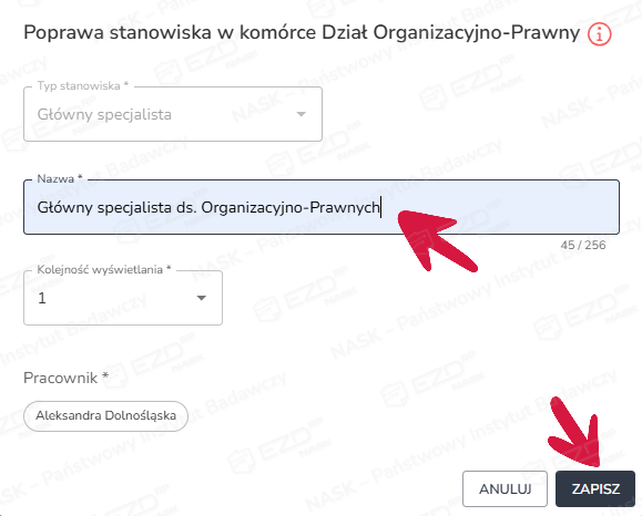 Pojawi się wówczas formularz pt. Poprawa stanowiska w komórce + (nazwa komórki). Należy w nim poprawić zauważone literówki lub uzupełnić nazwę stanowiska do pełnego brzmienia. Opcjonalnie można również zmienić miejsce wyświetlania stanowiska w drzewku struktury. Po wykonaniu zmian trzeba wybrać opcję Zapisz.