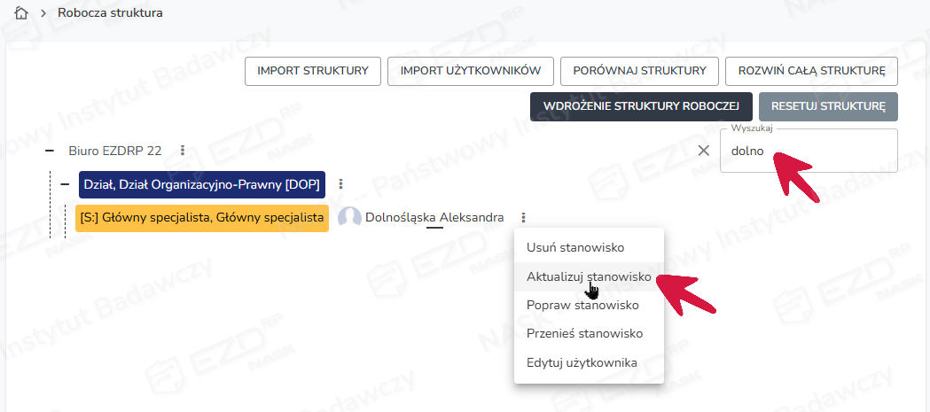 W przypadku potrzeby wykonania formalnej zmiany stanowiska, która ma zostać odzwierciedlona w systemie EZD RP, z zachowaniem nadanych uprawnień, dostępu do bieżących spraw, zadań oraz historii działań, wykorzystujemy znajdującą się w programie KUiP opcję Aktualizuj stanowisko. Funkcja ta dostępna jest w module Struktura > Struktura Robocza – przy stanowisku. Opcjonalnie odnalezienie stanowiska do poprawy może zostać poprzedzone wykorzystaniem funkcji Wyszukaj – poprzez wpisanie w polu początkowego fragmentu nazwiska użytkownika.