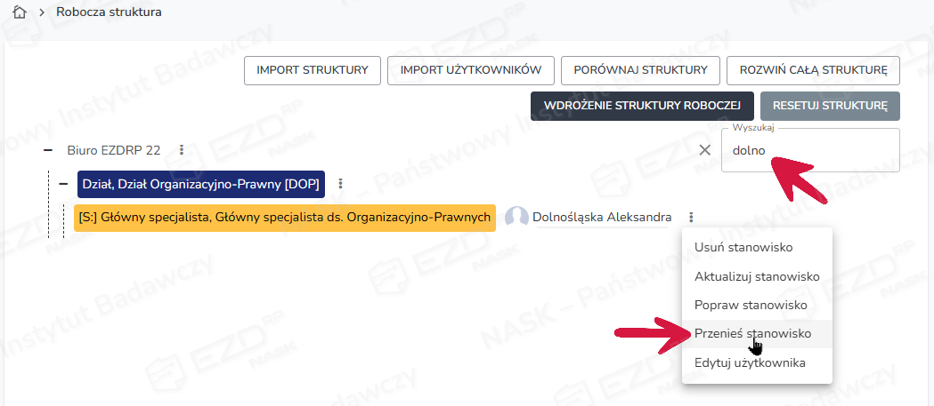 Przeniesienie stanowiska wykonujemy w programie KUiP – w module Struktura > Struktura Robocza – poprzez wybór znajdującej się przy stanowisku opcji Przenieś stanowisko. Opcjonalnie odnalezienie stanowiska do poprawy może zostać poprzedzone wykorzystaniem funkcji Wyszukaj – poprzez wpisanie w polu początkowego fragmentu nazwiska użytkownika.