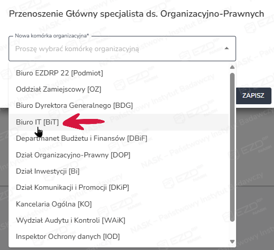 Pojawi się formularz pt. Przenoszenie + (nazwa stanowiska). Z listy Nowa komórka organizacyjna należy w nim wybrać komórkę, do której chcemy przenieść stanowisko pracownika, oraz zapisać zmianę.