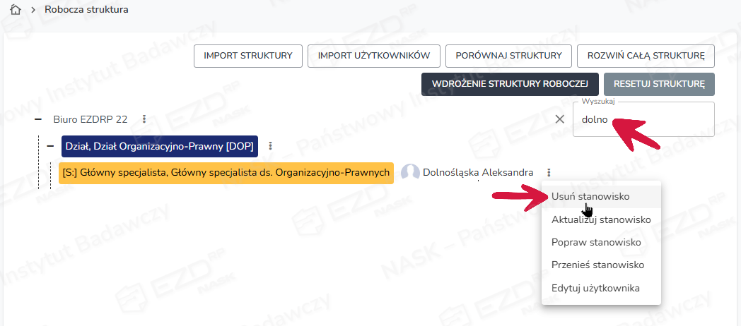 1. W programie KUiP należy usunąć stanowisko (lub stanowiska – jeżeli pracownik w programie EZD RP miał przypisanych więcej ról). W tym celu w module Struktura > Struktura robocza przy stanowisku wybieramy opcję Usuń stanowisko. Opcjonalnie odnalezienie stanowiska do poprawy może zostać poprzedzone wykorzystaniem funkcji Wyszukaj – poprzez wpisanie w polu początkowego fragmentu nazwiska użytkownika.