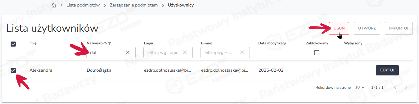 5. Po rozliczeniu się pracownika z zadań, usunięciu stanowiska i wykonaniu wdrożenia należy usunąć konto użytkownika. W module Lista podmiotów > Zarządzanie podmiotem > Użytkownicy oznaczamy odpowiednie konto. W jego odnalezieniu mogą pomóc znajdujące się w tym miejscu filtry Nazwisko, Login oraz E-mail. Następnie wybieramy opcję Usuń.