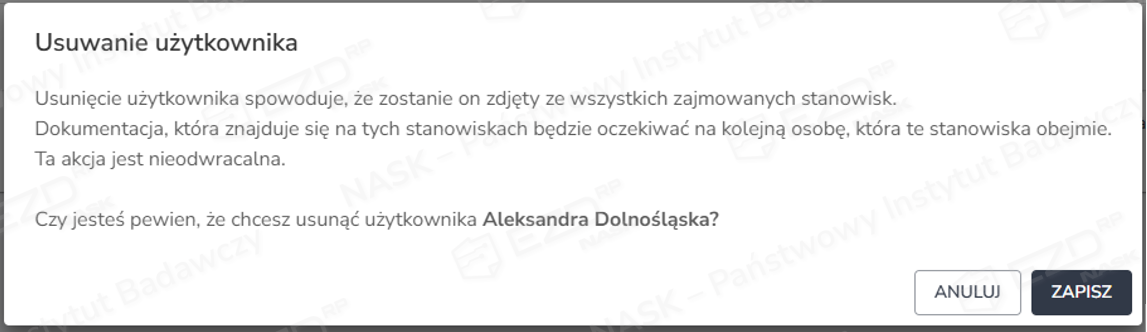 6. W celu potwierdzenia operacji usunięcia (która jest nieodwracalna) zostanie wyświetlony komunikat pt. Usuwanie użytkownika. Wybranie opcji Zapisz spowoduje trwałe usunięcie konta użytkownika.